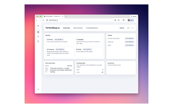 PerfectReply.ai (Local v1) هو إضافة لمتصفح Chrome مصممة لتعزيز كفاءة التواصل للمهنيين الذين يشاركون في المراسلات المتكررة. هذه الأداة المجانية تتيح للمستخدمين إنشاء ردود سريعة وواعية للسياق من خلال تمييز النص واستخدام أنماط كتابة مخصصة تعتمد على الصور الرمزية مصممة لأدوار مختلفة مثل المبيعات والدعم والعمليات. التكامل مع قاعدة المعرفة، المستمدة من الملفات المرفوعة وعناوين URL، يمكّن من إنشاء ردود ذات صلة تحافظ على الوضوح وتناسق العلامة التجارية.